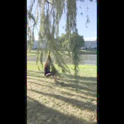 A woman tries to swing from a small tree branch in her front yard and her feet slip forward on the ground. Then a teen girl tries to swing from the same branch which causes the branch to break suddenly and the teen girl falls on her back.