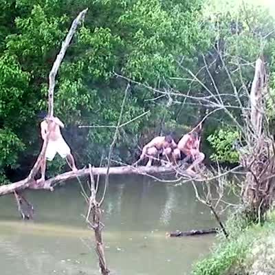 A man stands on a tree branch hanging over a river. He plans attempt to jump from the branch to a bridge next to the tree. Before he can jump the branch breaks and he falls into the water below. The men and young boys with him laugh at him.