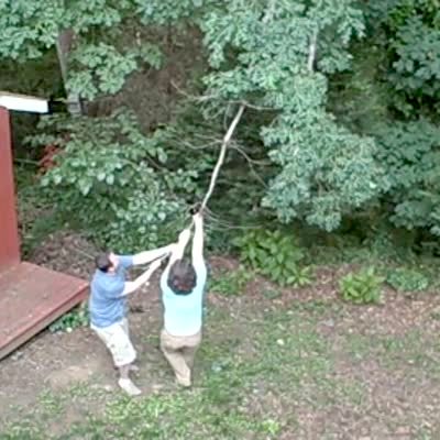 A tree branch falls on top of a man in the yard when he jumps with a rope attached between him and the tree to make it break.