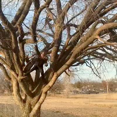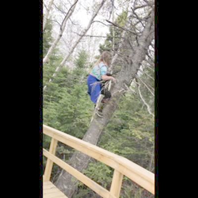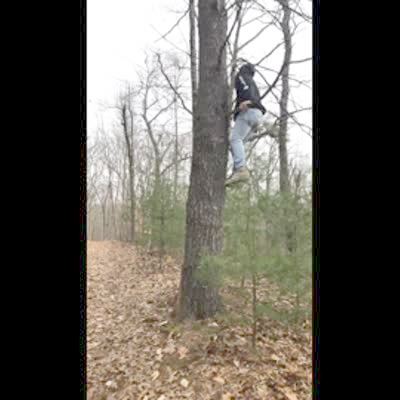 A man climbs a tree on a trail in the woods and says that the branches are strong and then multiple branches break and he falls out of the tree.