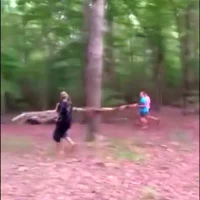 Three teenagers at a campground run at a tree with a long branch and try to snap it but it doesn't break and the teen boy falls down.