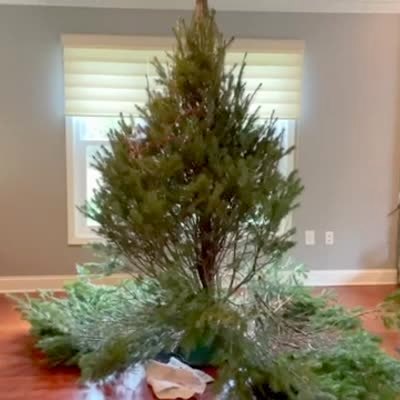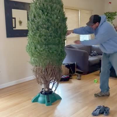 A man cuts a string at the bottom of a fresh Christmas tree in the living room and the branches fall to the floor. The man insists he did "nothing."