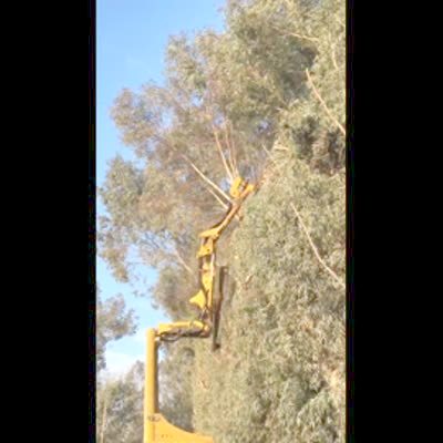A construction vehicle cuts tree branches in the yard and a large branch falls on the roof of the breezeway and the roof collapses.
