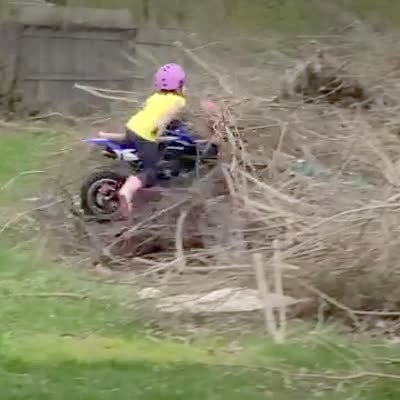 A young girl rides on a dirt bike in a yard and crashes into a pile of sticks and branches. TikTok video.