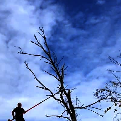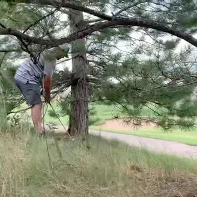 A man gets knocked off of a ladder as he cuts a dead branch off of a tree.