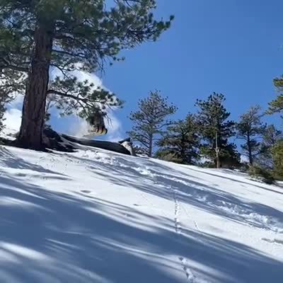 Two men are sledding down a snowy hill when they go over a jump. They fly into a tree branch and crash and fall.
