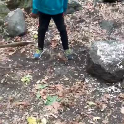 A teen girl slips off of tree stump over a creek and falls into the water after the guy behind the camera says she will fall.