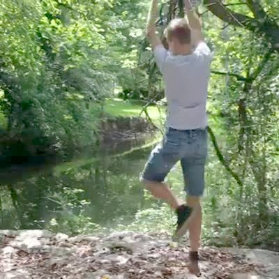 A young boy jumps onto a tree branch, and it hits him in the groin.