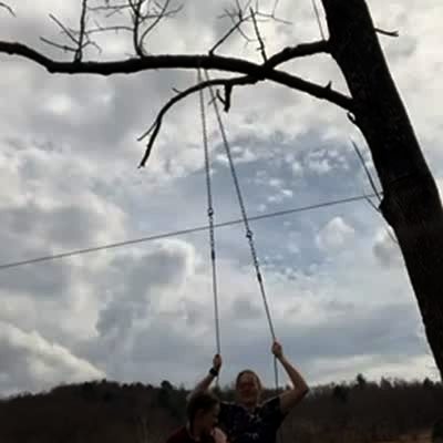 Three adult cousins sit on a wooden swing hanging from a tree when they fall to the ground, laughing.