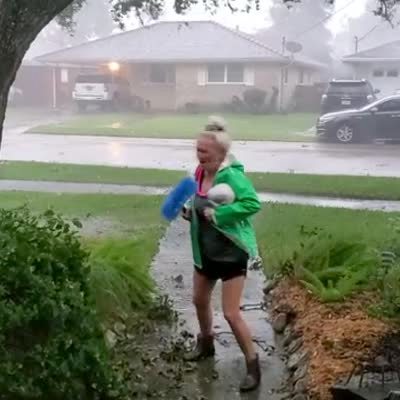 A woman stands in the front yard with a Halloween decoration, and talks about hurricane Zeta as rain whips around her. The wind picks up, then a branch breaks off a tree and knocks her over.