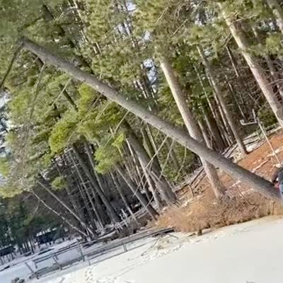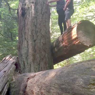Two men try to move a large pine tree when one of them gets pinned under the trunk..
