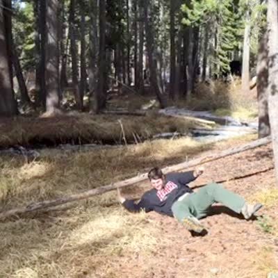 A man crosses a log, then slips and falls onto the ground in a forest.