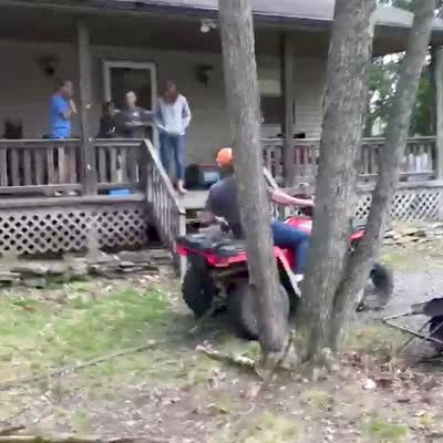 A man drives an ATV attached to a tree with a band. A tree branch snaps over his head in a yard.