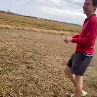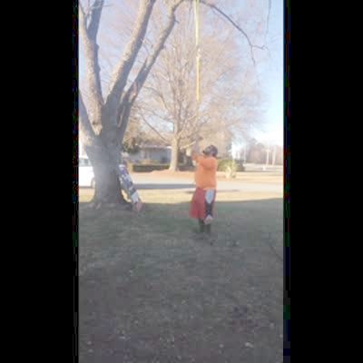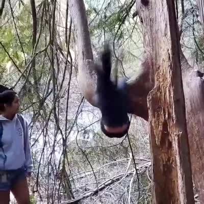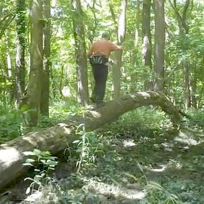 A man pushes a tree back and forth. A woman off camera jokes about having to "take him to the hospital." The tree breaks and almost falls on the man and the woman says, "Oh Shit."