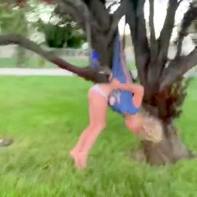 A young girl hangs by her dress from a tree branch in the yard and repeatedly yells "get me down" while the woman behind the camera laughs at her.