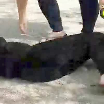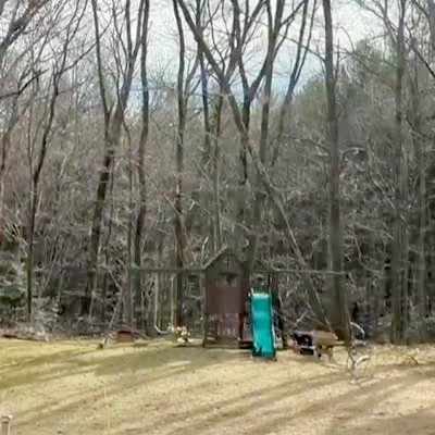 A man standing on his front porch takes his two dogs outside when lightning strikes a tree limb causing it to fall down into the yard. The large branch luckily doesn't hit his nearby dog.