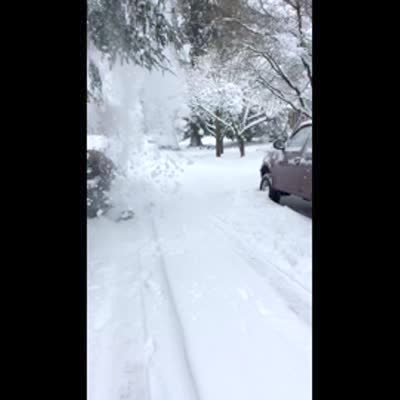 A man shovels snow on the driveway, until a tree branch breaks and dumps snow on the driveway again. Security footage.