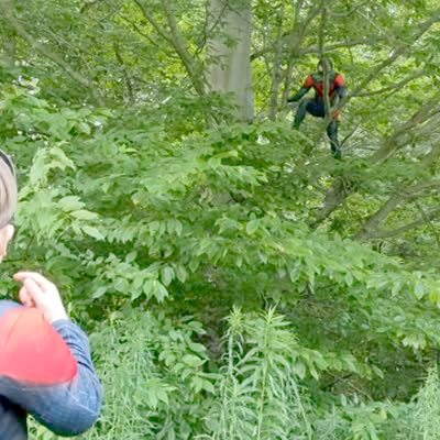A man in a Spider-Man costume appears in a tree to surprise a tot boy for his birthday. He starts to climb down and falls out of the tree.