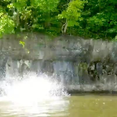 A teen boy grabs a branch and falls on a rock, then falls into the water outdoors.