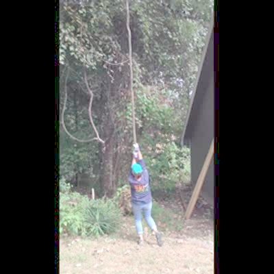 A man cuts a tree in the yard and the woman with the camera yells "timber." The tree falls on a playground.