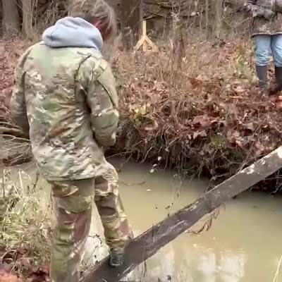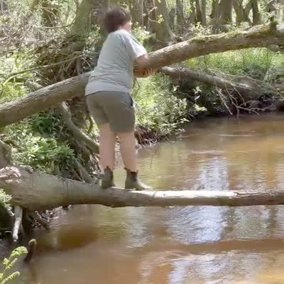 A teen boy walking across a piece of wood over a creek falls and lands on his groin.