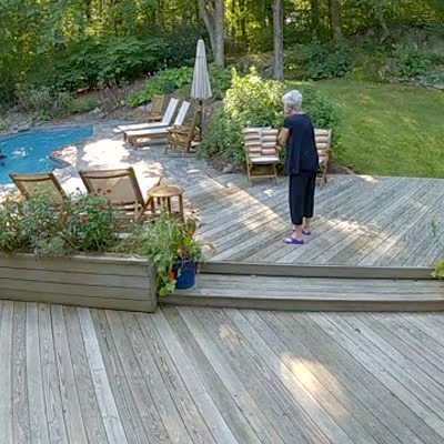 A man uses a pool net to smack a beehive off a tree branch in a yard. The hive falls to the ground, then a swarm of bees attack the man and he jumps into the pool and yells. Security footage.