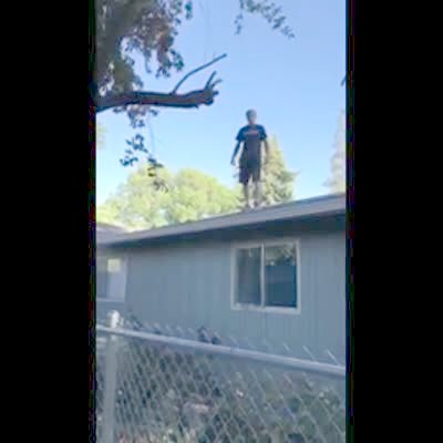 A man stands on a roof and saws branches off a tree, then a branch hits him and he falls.