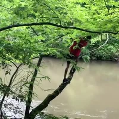 A young boy's pants get caught on a branch and he flails his legs while his belly hangs out of his shirt as he tries to free himself.