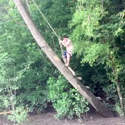 A man climbs a tree to swing from a rope, but he falls off of the tree.