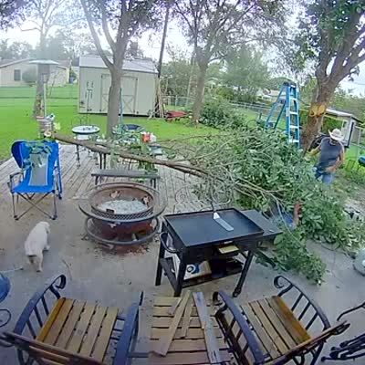 A branch falls on a man trimming a tree and he's knocked off his ladder and falls to the ground. A short while later an even larger section of the tree falls om him. His family runs out into the yard to help him by lifitng the tree limb off of him. Security footage.