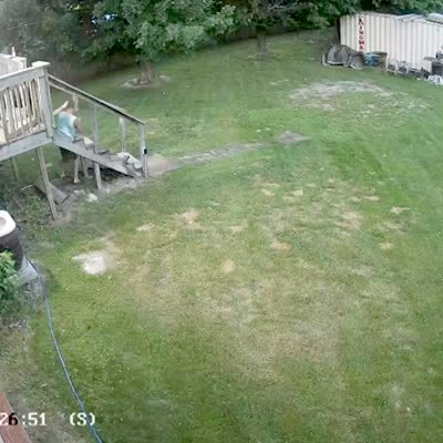 A man walks down the steps in the backyard but he falls through when the steps break. Security footage.