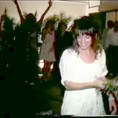 Action begins at 25 seconds. A man and woman cut their wedding cake, and then they shove it in each other's faces but the man's pants fall down. Music rights not cleared.