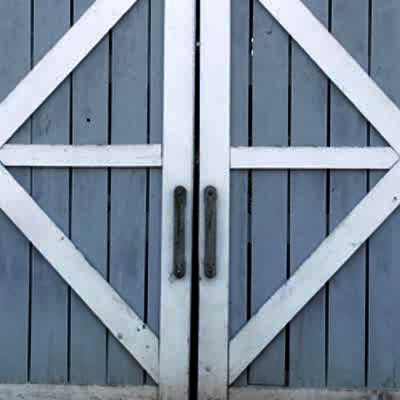 A woman in a wedding dress falls down when she walks out of a barn as the doors open.