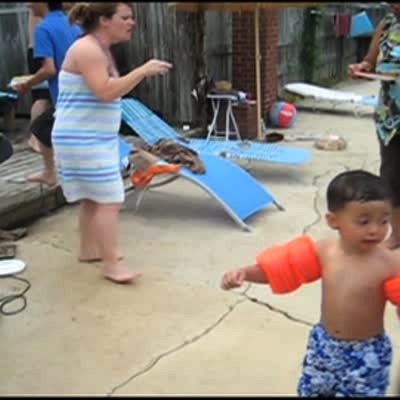 At man's birthday, he blows out the candles while standing in a pool. A friend drops the cake on him in the pool accidentally.