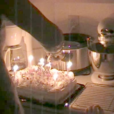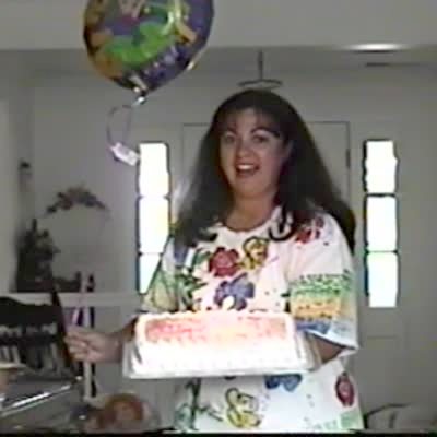 A family sings "Happy Birthday" to a woman on a patio, but her stepmother drops the cake on the floor, and they all laugh. Someone asks if they can still eat it, then they pick up the cake as a man continues to sing, and the woman's stepmother presses her face into the cake.