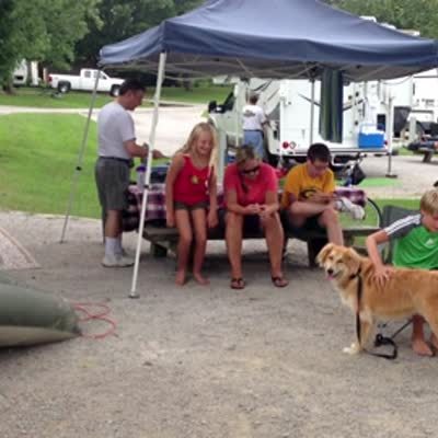 A man exits a camper at a campground and another man emerges from under the camper and hisses at him. The first man jumps. Social media video. Music rights not cleared.