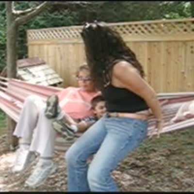 Three young girls all wear baseball caps and dance to music in a basement. One girl moves her head and makes her hat fly off. The hat ends up on the head of the girl next to her.