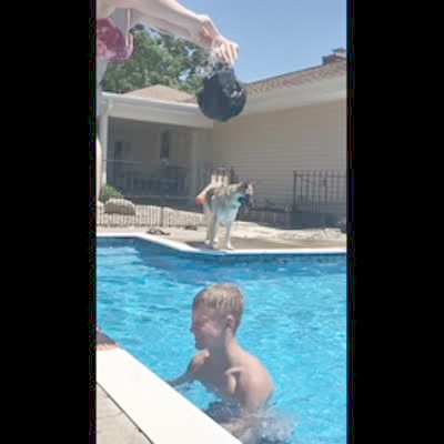 A man stands in a swimming pool in a yard and throws a water balloon into the air. It lands on his head and bursts and the balloon wraps around his head like a swimming cap then pops off on its own. Clip plays twice and the second one is in slow motion.