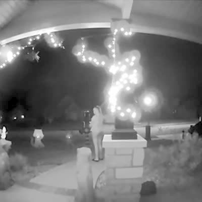 A doorbell camera captures a woman that runs into the house and falls while she screams when a car alarm goes off at night.