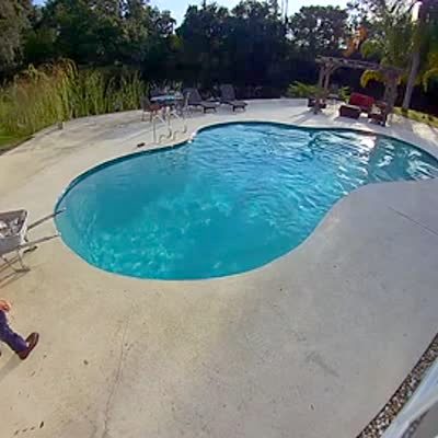 A security camera captures a man walk backwards with a wheelbarrow and fall into a pool in a backyard.