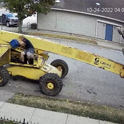 A man outside in a neighborhood doing some work on a piece of construction machinery. The man spills some fuel on the machine, and loses his footing. We hear him fall in such a spectacular way. Security camera footage