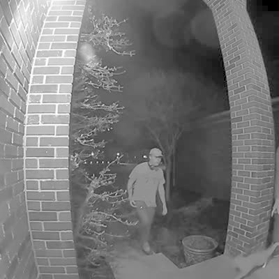 A man tries to catch a kitten cat on a front porch, then a bird flies towards him and he runs away and screams. A teen girl walks out and asks what happened. Security camera footage.