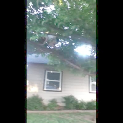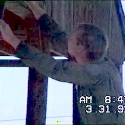 Two men stand under a carport roof. One pulls at a loose tile with a shovel. The ceiling gives a bit, then collapses entirely. Both men narrowly avoid the debris. Security camera video.
