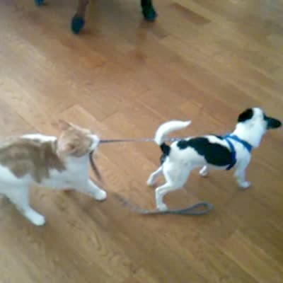 A cat pulls on a small dog's leash indoors and pulls it away from the front door.