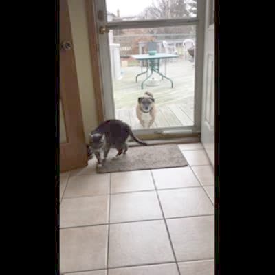 A dog tries to get outside but a cat guards the back door and hits the dog in the head repeatedly.
