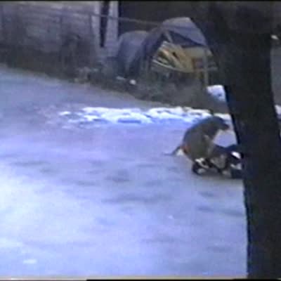 Ice Fall. Dog slides on ice and makes boy fall down.