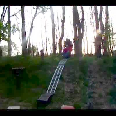 A teen boy swings from a rope hanging from a tree. He slides off the rope, gets his foot caught on a knot at the end of the rope, and lands on his face. No tails. Caucasian.