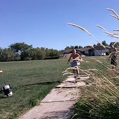 Teen girl tries to ride bike off ramp into pond, stumbles and falls off ramp. Caucasian.