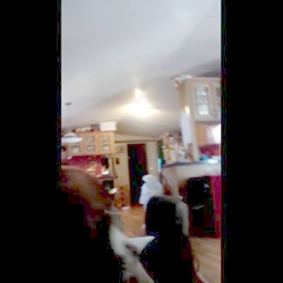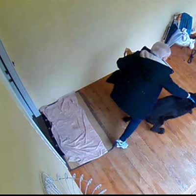 A senior woman grabs the collar of a giant Schnauzer dog and the dog pulls her across the patio and she falls into the porch swing bench which then swings out and she falls off the patio and onto the ground. Security camera footage.