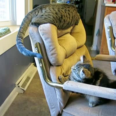 A striped kitten cat paws at the swinging tail of another cat and home and then falls off of a chair.